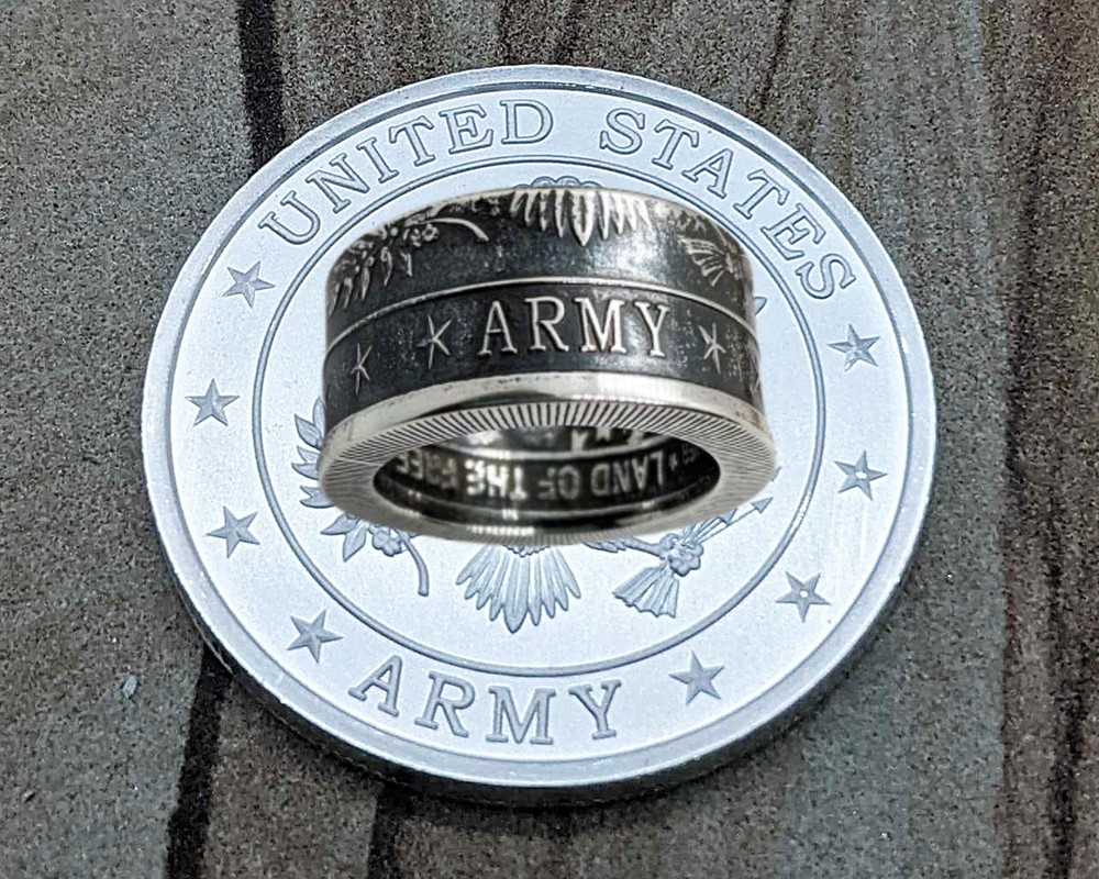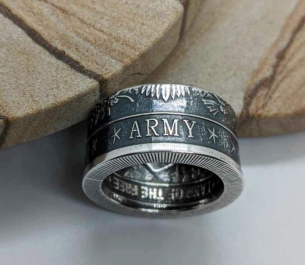 Own a piece of history with this stunning Army Coin Ring! Handcrafted using a Silver 1 troy ounce Coin. This unique ring showcases intricate details of United States and Army. The coin is skillfully transformed into a statement ring, perfect for any coin collector or history enthusiast as well as a Service member or Veteran. Capture the elegance and charm with this timeless piece of jewelr